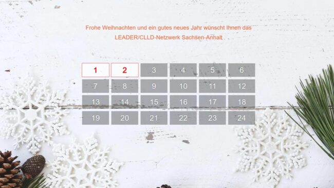 Update: Türchen Nr. 5 stelle unsere LAG vor. https://leader-sachsen-anhalt.de/adventskalender/ Hier geht es direkt zum Inhalt des Türchens: https://leader-sachsen-anhalt.de/wp-content/uploads/2025/11/LEADER-LAG-05.pdf —– Im Rahmen der diesjährigen Öffentlichkeitsarbeit hat das LEADER/CLLD-Netzwerk Sachsen-Anhalt einen besonderen digitalen Adventskalender vorbereitet. Vom 1. bis 24. Dezember 2025 wird täglich eine der 24 Lokalen Aktionsgruppen des Landes vorgestellt. Das zeigt, wie LEADER vor…